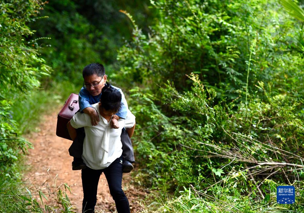 8月15日,黃淑珍背著(zhù)丈夫走在出診路上。由于出診的部分道路無(wú)法通車(chē),黃淑珍只得背著(zhù)丈夫緩緩前行。