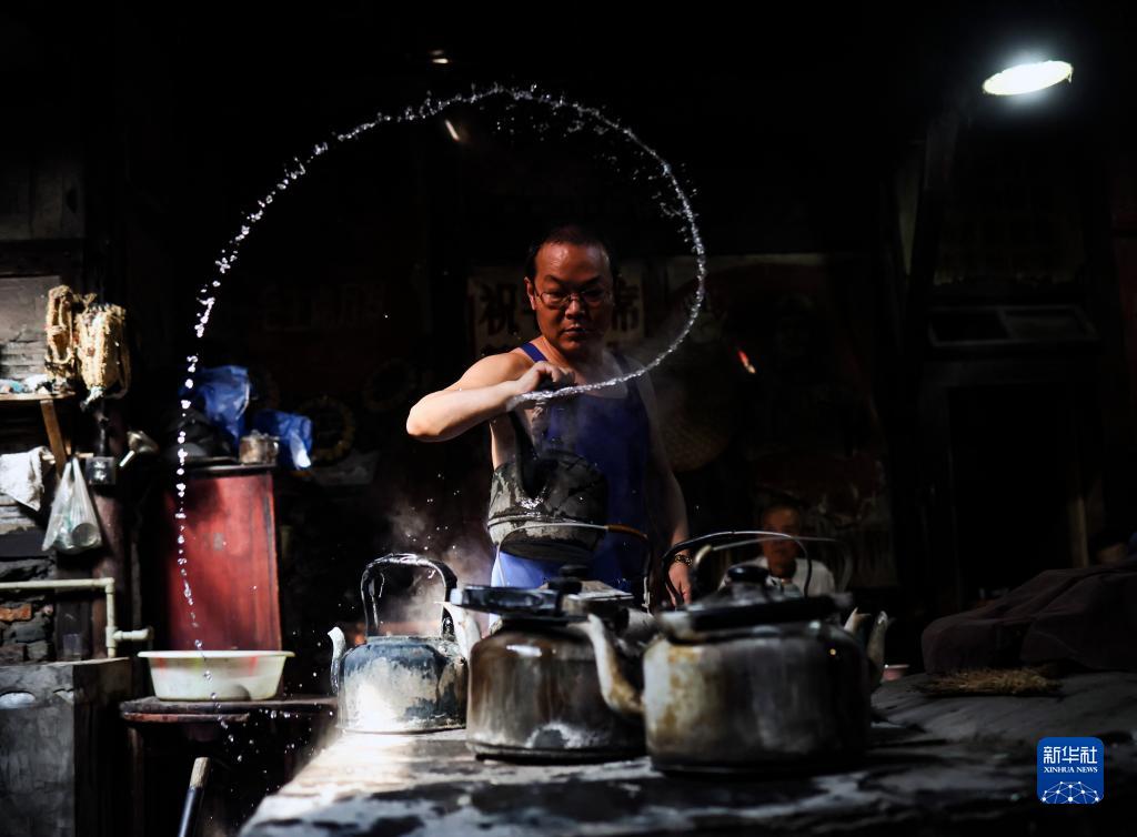 老板李強在給客人表演用壺中的水在空中甩出造型,這是他的拿手絕活(8月7日攝)。