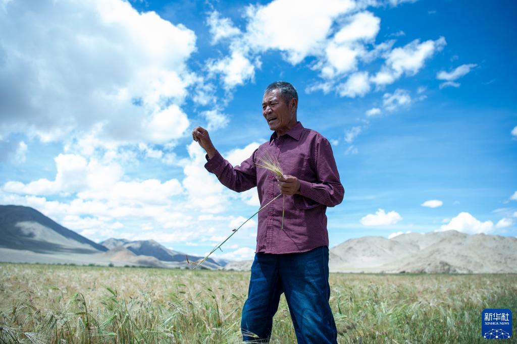 “自力更生,艱苦奮斗?!笔蔷妹览先说目陬^禪。家人常勸他不要再來(lái)地里勞作,他卻說(shuō):“雖然現在生活條件越來(lái)越好,但是我們不能忘本?!弊咴谇囡锢?,老人不時(shí)俯下身子查看青稞長(cháng)勢。有的青稞生長(cháng)狀況不佳,他便會(huì )皺起眉頭,與村民們商量解決辦法?!跋乱徊竭€是應該繼續提高機械化水平,讓青稞長(cháng)得更多更好?!本妹览先诵χ?zhù)說(shuō)。