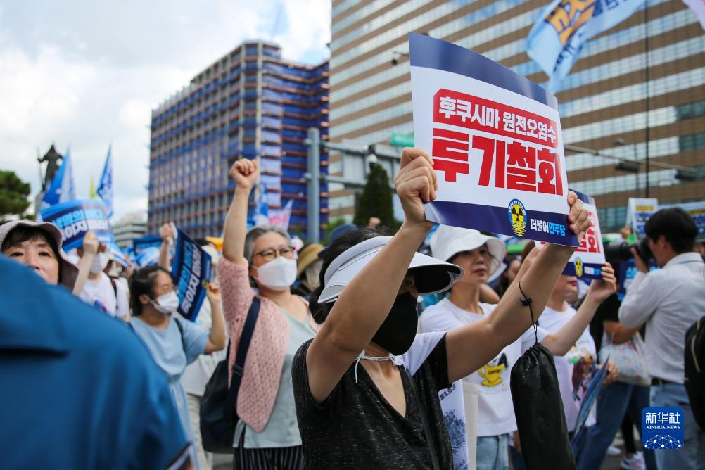 當日,韓國最大在野黨共同民主黨成員和眾多市民聚集在首爾光化門(mén)廣場(chǎng),手舉標語(yǔ)進(jìn)行示威游行,抗議日本核污染水排海。日本政府24日啟動(dòng)福島核污染水排海,這一決定遭到國際社會(huì )的批評和反對。
