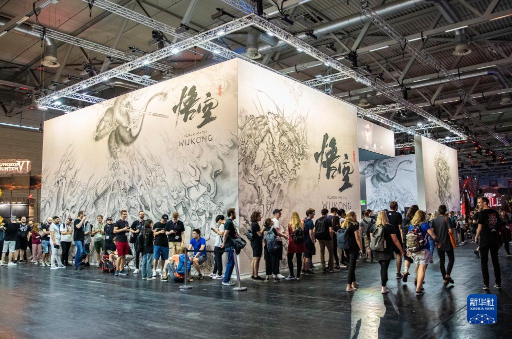 8月23日,在德國科隆游戲展上,玩家在游戲科學(xué)展臺前排隊試玩游戲。