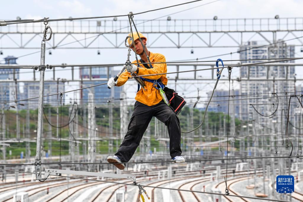 當日,中國鐵路南寧局集團有限公司南寧供電段的接觸網(wǎng)工對南寧第二動(dòng)車(chē)所存車(chē)線(xiàn)內26條股道中達到檢調標準的股道進(jìn)行檢查,為即將全線(xiàn)開(kāi)通的貴南高鐵做準備。