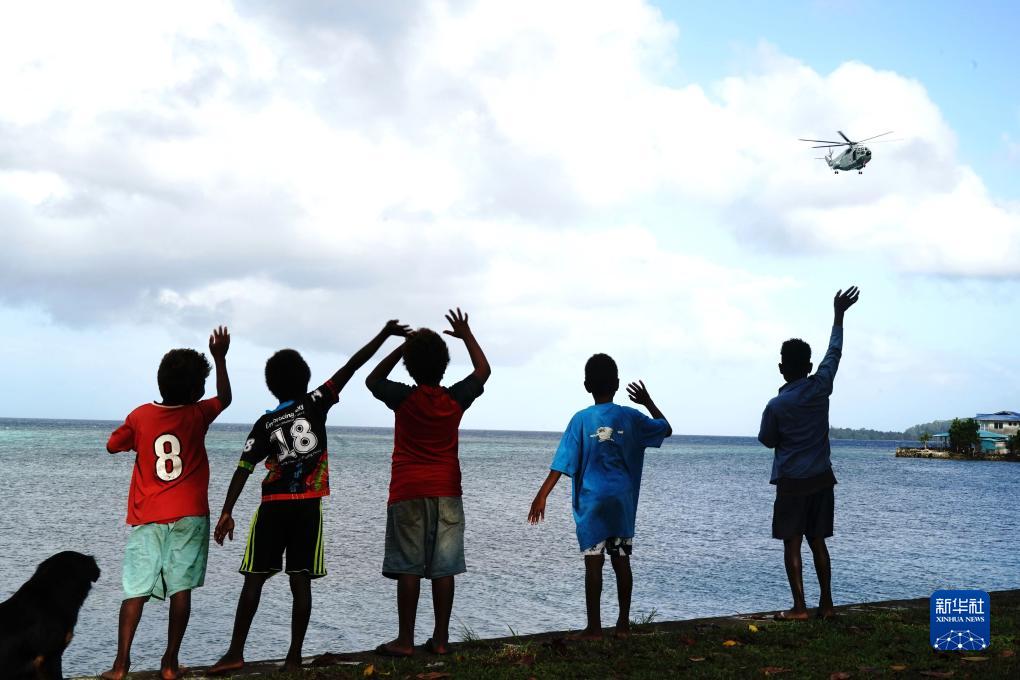 8月24日,中國海軍“和平方舟”號醫院船醫療分隊搭乘艦載醫療救護直升機前往所羅門(mén)群島圖拉吉島巡診,島上的孩子們揮手致意。