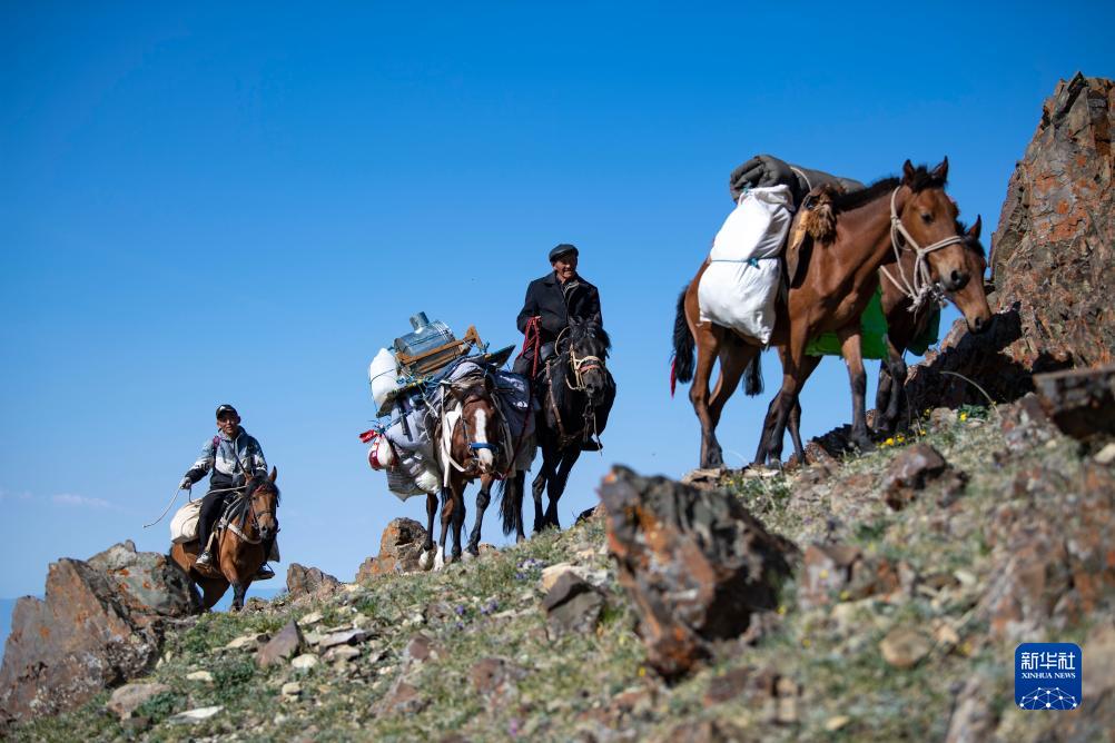 新疆塔城地區裕民縣牧民哈布得拉什么(前)和女婿阿依薩騎馬在陡峭的牧道上行進(jìn),他們將轉到高山夏季牧場(chǎng)(7月4日攝)。