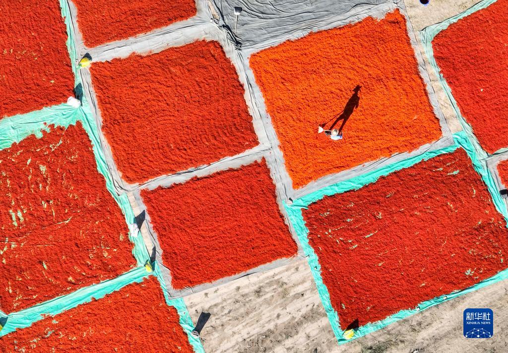 新疆裕民縣江格斯鄉的村民在晾曬紅花絲(7月7日攝,無(wú)人機照片)。