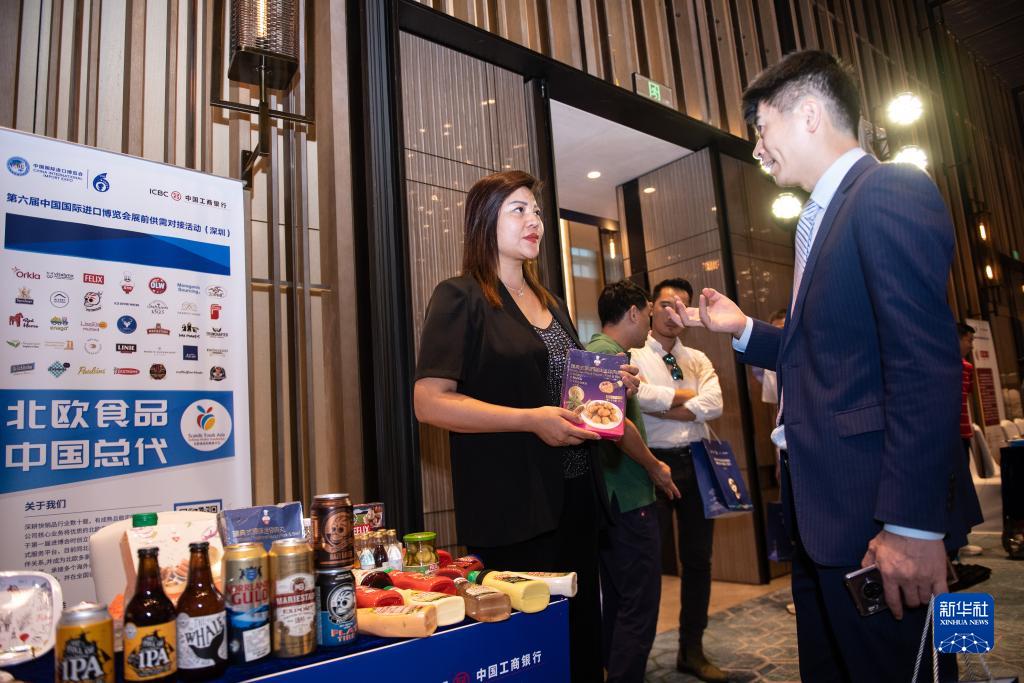 8月29日,在深圳舉行的進(jìn)博會(huì )展前供需對接活動(dòng)上,采購商(右)了解北歐食品。
