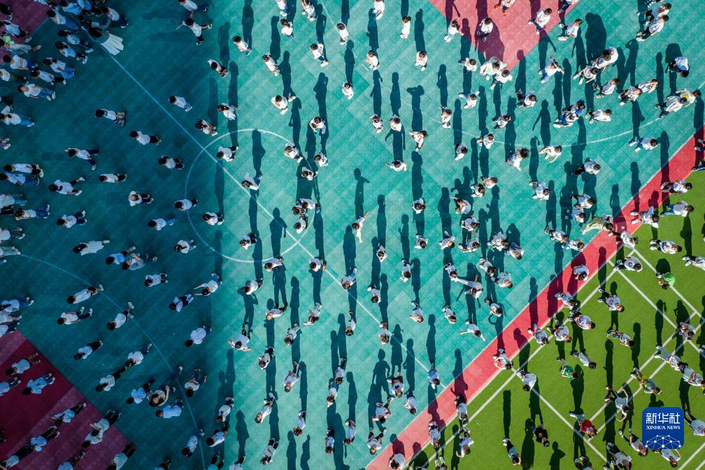 9月1日,武漢市紅鋼城小學(xué)師生在參加開(kāi)學(xué)典禮。