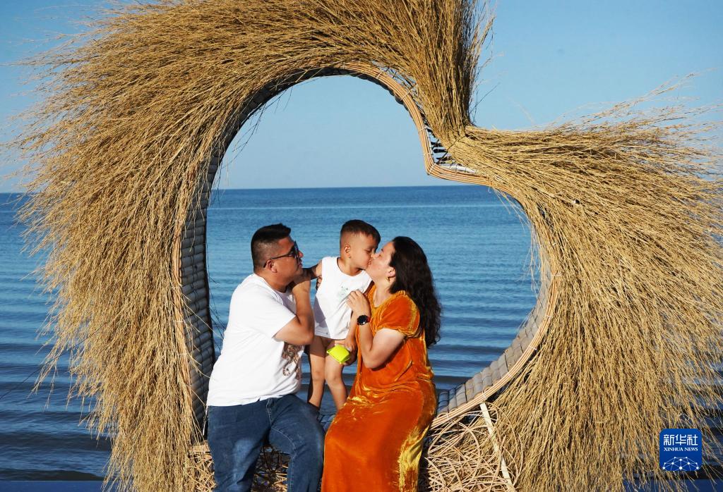 8月31日,游客在新疆博斯騰湖大河口景區拍照。
