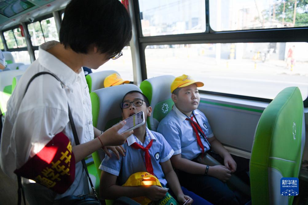 9月1日,在北京市豐臺區一輛通學(xué)公交車(chē)上,北京市豐臺區第一小學(xué)的老師(左)在核對乘車(chē)的學(xué)生信息。