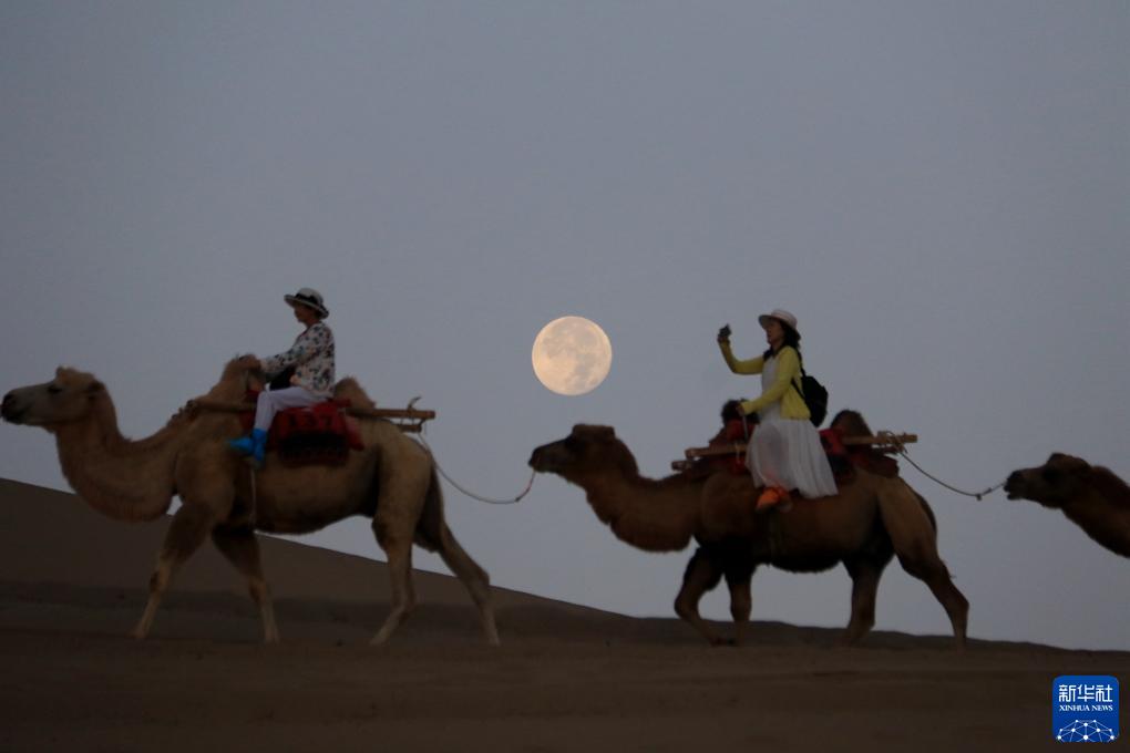 9月1日清晨,一輪圓月懸掛在甘肅省敦煌市鳴沙山月牙泉景區上空,游客騎乘駱駝,領(lǐng)略大漠風(fēng)光。