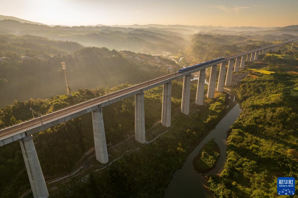 8月31日,一列動(dòng)車(chē)組在晨曦中經(jīng)過(guò)位于貴州省獨山縣郊外的貴南高鐵銀坡河特大橋(無(wú)人機照片)。