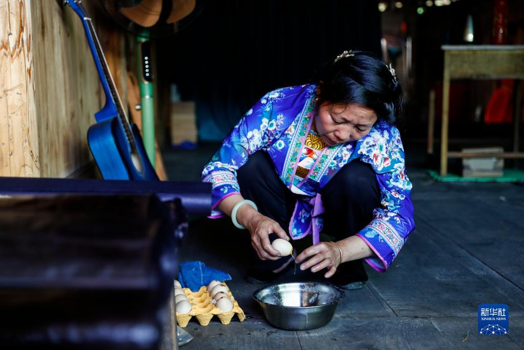 烏英苗寨婦女梁足英在取雞蛋清,準備給布料涂抹(2023年8月30日攝)。新華社記者 胡星宇 攝