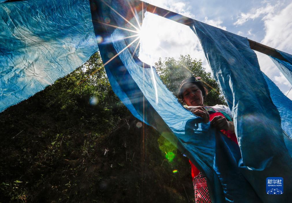 烏英苗寨婦女梁足英在晾曬第一次浸染后的布料(2023年8月31日攝)。新華社記者 胡星宇 攝