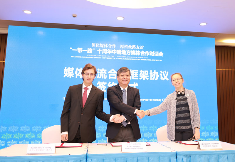 山東廣播電視臺與哈薩克斯坦《實(shí)業(yè)報》、“今日哈薩克斯坦”通訊社簽署協(xié)議現場(chǎng)。新華網(wǎng)發(fā)
