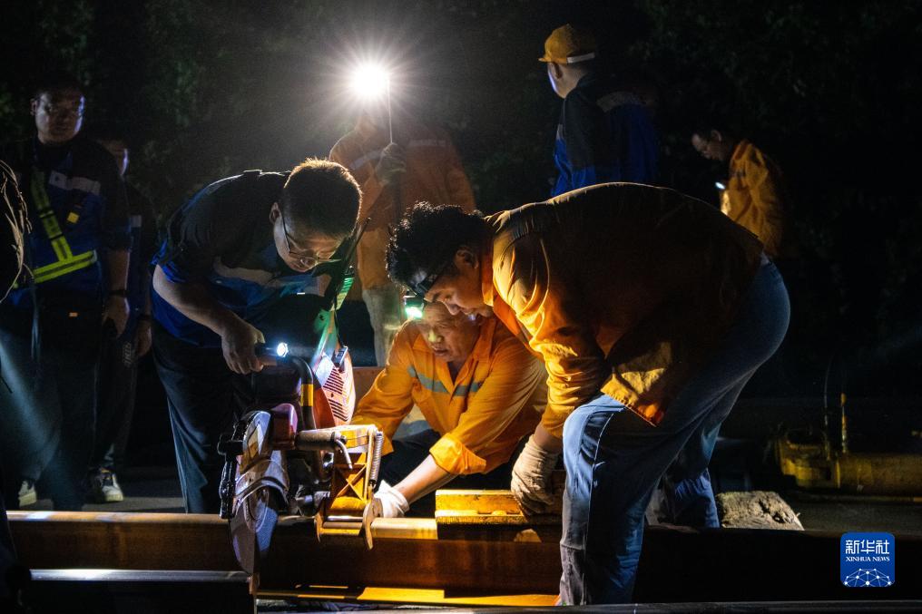 9月6日凌晨,鐵路工人在京廣高鐵株洲西至衡山西區間進(jìn)行換軌施工。