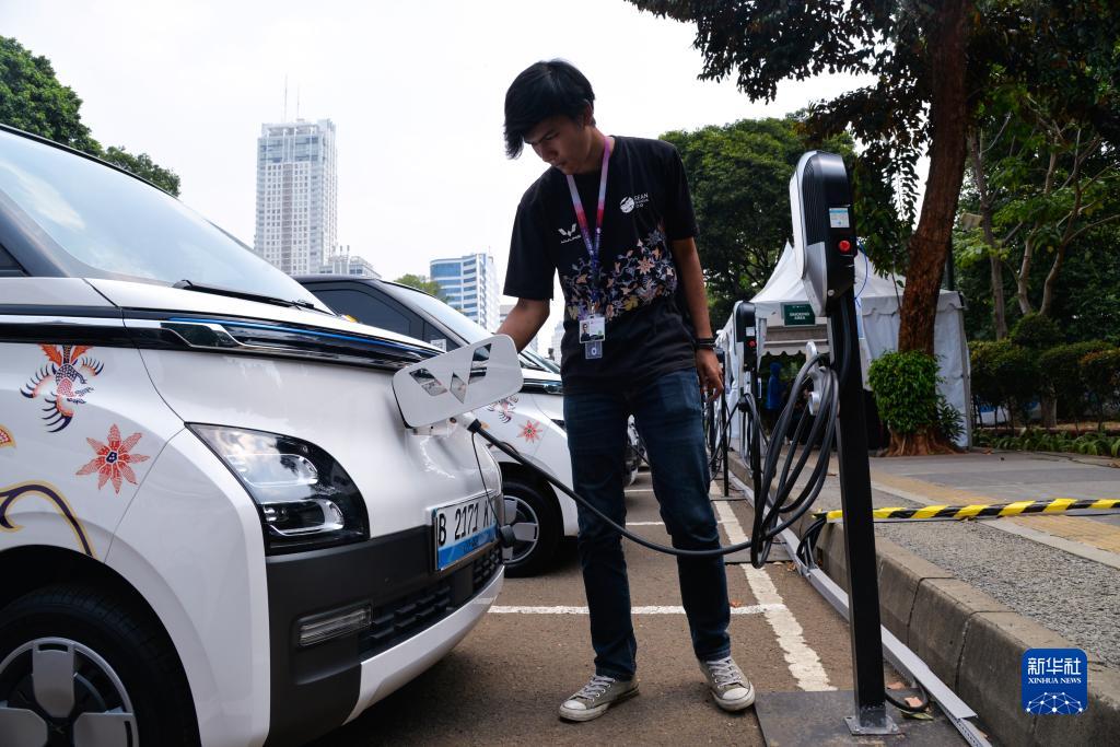 9月6日,在印度尼西亞雅加達第43屆東盟峰會(huì )五菱汽車(chē)服務(wù)站,工作人員為一輛五菱新能源車(chē)Air ev充電。
