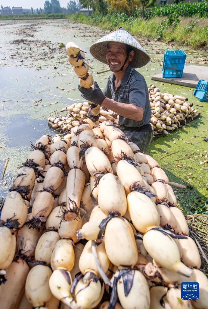 9月7日,農戶(hù)在江蘇省泰州市姜堰區顧高鎮夏莊村蓮藕種植基地分揀采收的蓮藕。