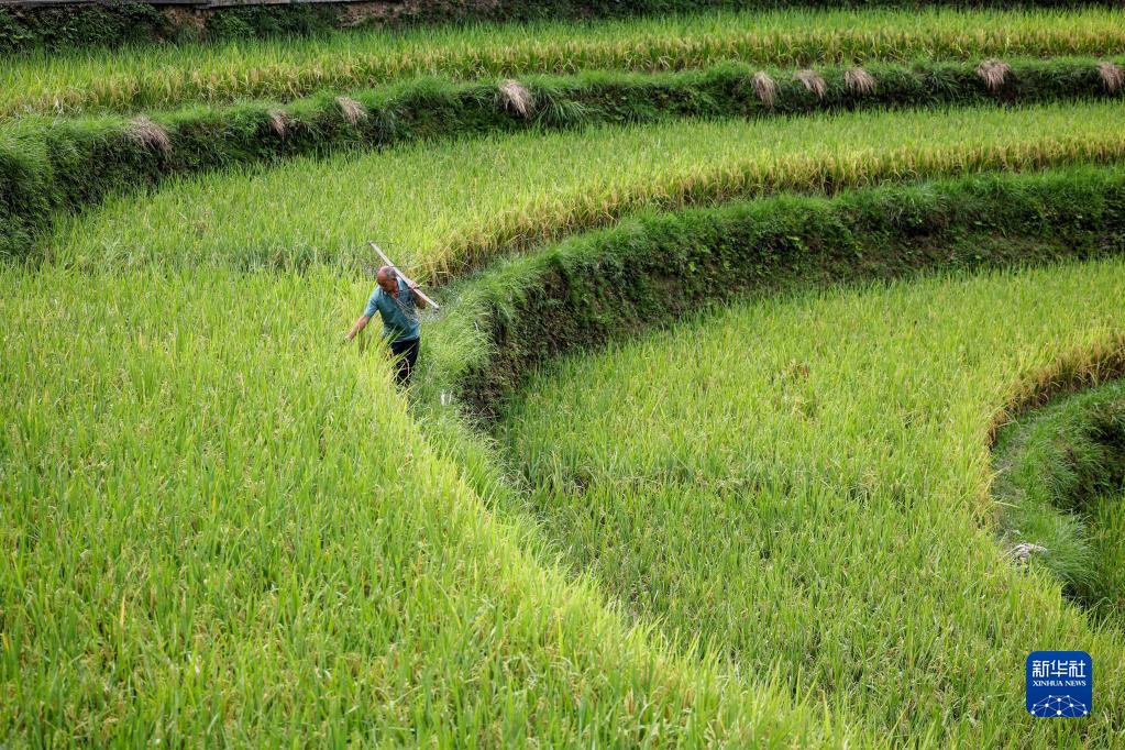 9月7日,村民在貴州省黔東南苗族侗族自治州丹寨縣排調鎮黨干村查看水稻長(cháng)勢。
