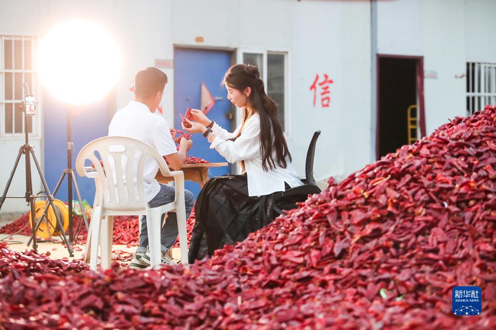 9月6日,在河南省商丘市柘城縣辣椒加工企業(yè),當地電商主播在直播銷(xiāo)售辣椒產(chǎn)品。