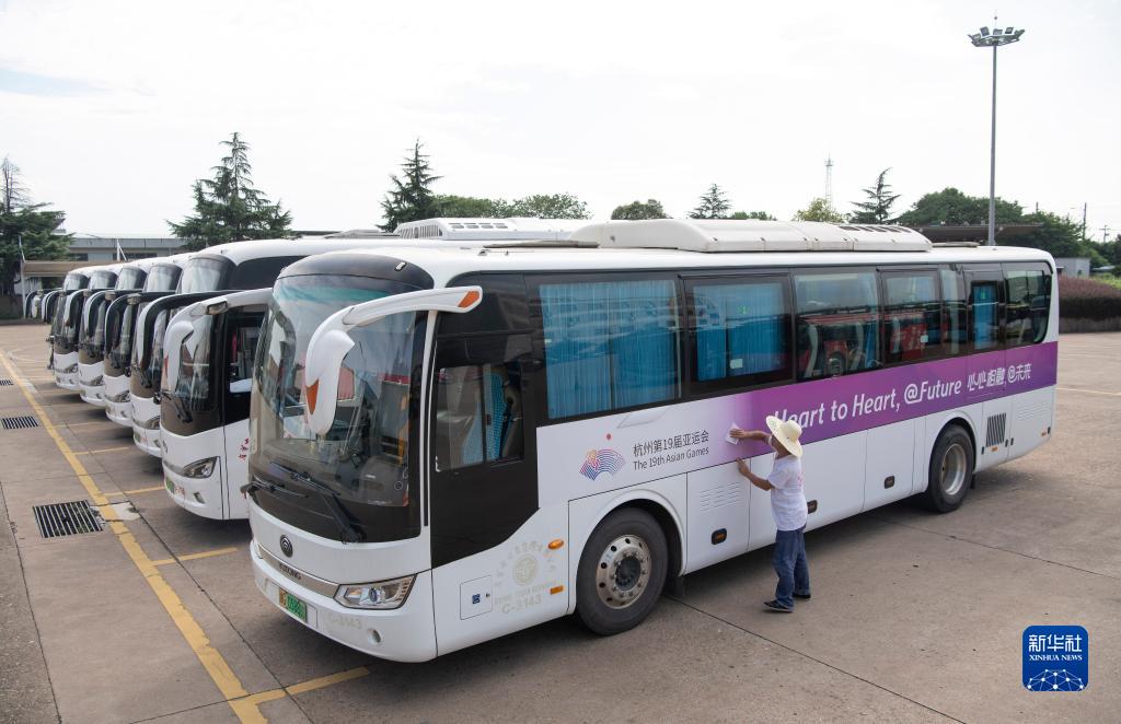 杭州亞運會(huì )臨近,浙江省金華市金華公交集團三公司的工作人員給車(chē)輛貼上亞運主題車(chē)貼,為公交車(chē)換上“亞運新裝”。金華市是杭州亞運會(huì )協(xié)辦城市之一,將承辦足球和藤球比賽。