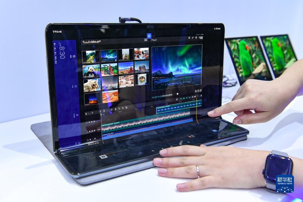 9月7日,在“2023世界顯示產(chǎn)業(yè)大會(huì )新型顯示創(chuàng )新成果展”現場(chǎng),工作人員在展示京東方17.3"X-Fold十字折疊OLED。