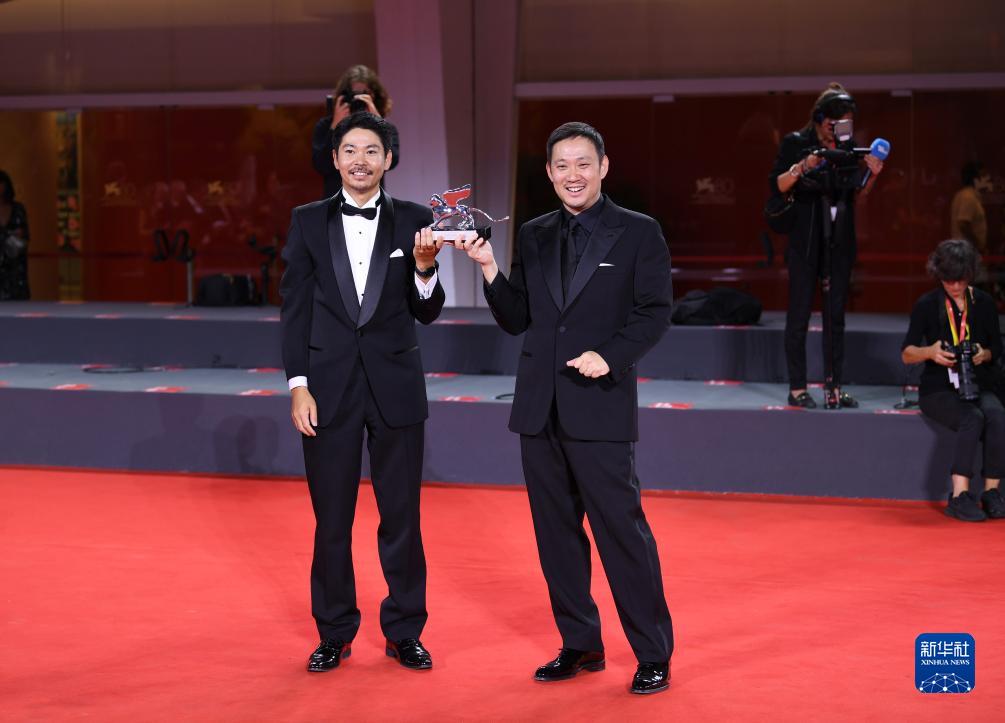 9月9日,在意大利威尼斯,獲得評審團大獎銀獅獎的電影《邪惡不存在》的導演濱口龍介(右)和演員大美賀均展示獎杯。