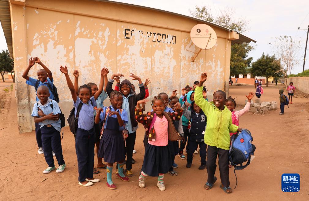 7月25日,莫桑比克馬普托省皮科科村學(xué)校的孩子們站在裝有中國援助的衛星電視接收天線(xiàn)的房屋前。