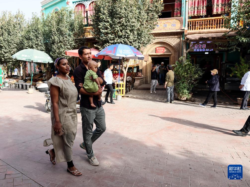 迪力夏提抱著(zhù)孩子和海迪雅走在喀什古城景區的巷道內(9月7日攝)。