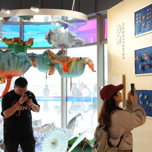 9月12日,媒體記者參觀(guān)亞運村內展示的銅雕、根雕作品。