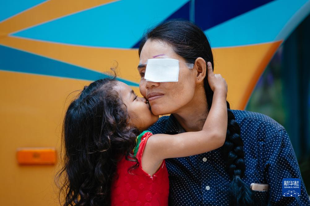 這是2019年3月15日,在柬埔寨磅湛省醫院,即將接受白內障手術(shù)的患者孫美樂(lè )接受女兒的親吻祝福。孫美樂(lè )是柬埔寨一名貧困的單身母親,左眼患上白內障幾近失明。在接受了中國醫療隊的白內障義診手術(shù)后,她的視力逐步恢復,生活有了新的光明和希望。