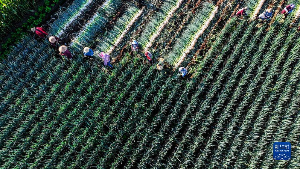 9月13日,農民在玉田縣虹橋鎮一大蔥種植基地收獲大蔥(無(wú)人機照片)。