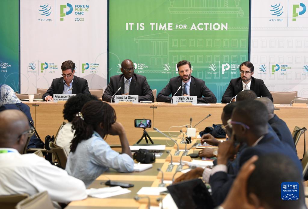 9月12日,在瑞士日內瓦世界貿易組織總部,世貿組織首席經(jīng)濟學(xué)家拉爾夫·奧薩(后排右二)在《2023世界貿易報告》發(fā)布會(huì )上發(fā)言。