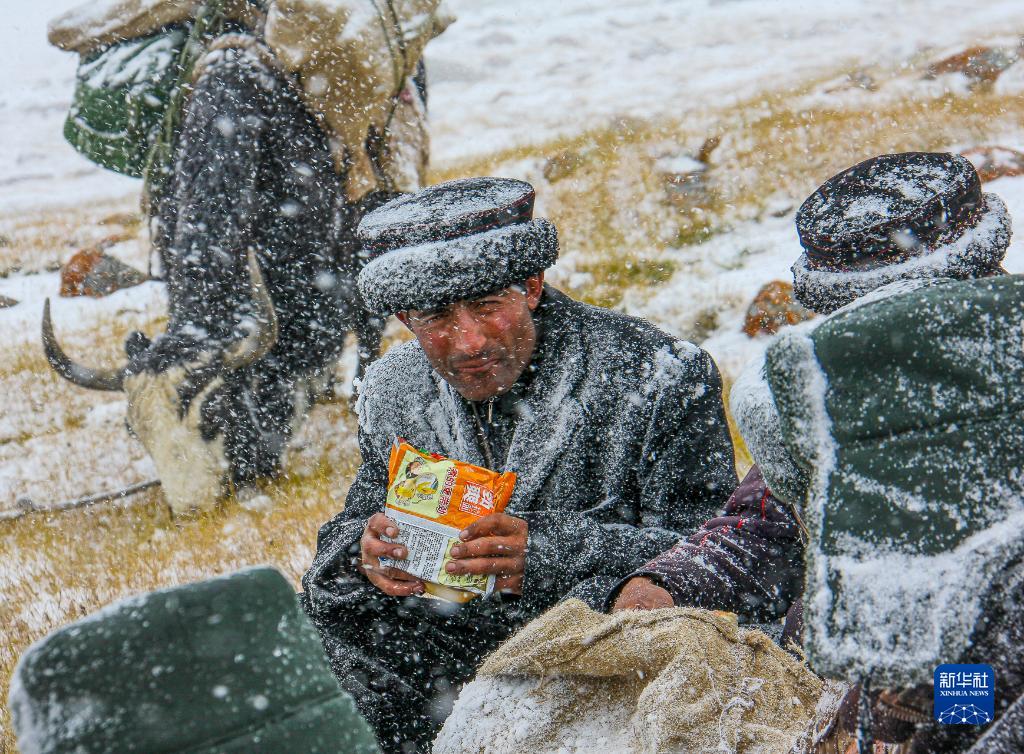 2010年9月24日,拉齊尼在邊境線(xiàn)巡邏時(shí),冒著(zhù)風(fēng)雪嚴寒在吃午飯。新華社發(fā)(王烈 攝)