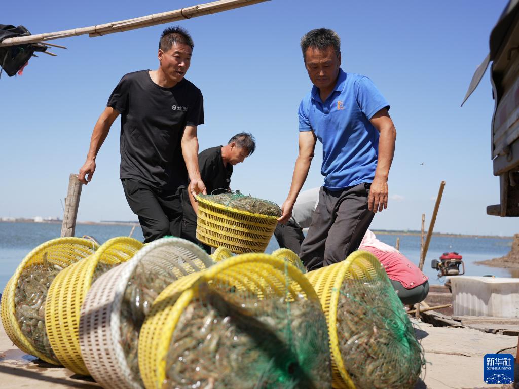9月13日,養殖戶(hù)在河北省滄州市海興縣小山鄉蔡家莊村養殖蝦池搬運剛收獲的對蝦。