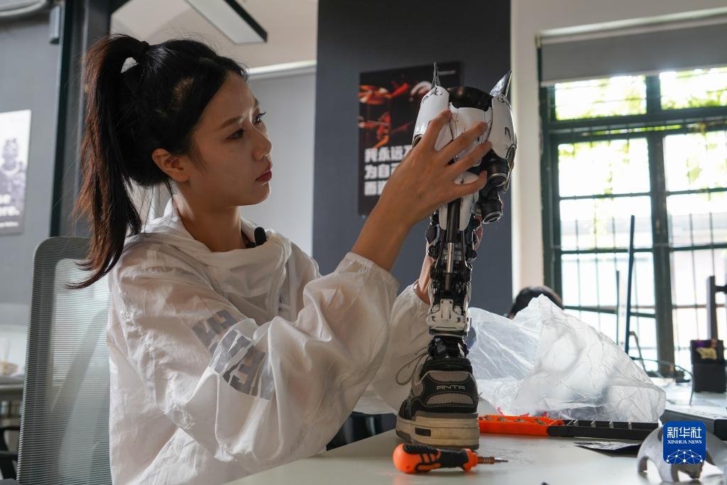 胡月在調試根據自己想法設計的假肢(6月20日攝)。新華社記者 胥冰潔 攝