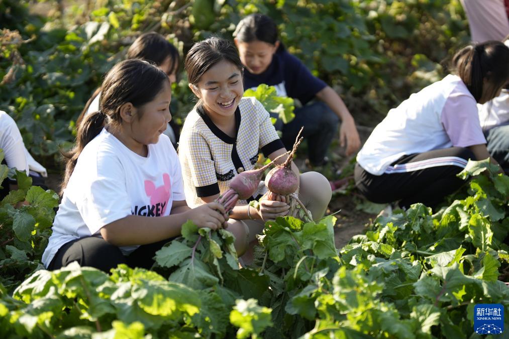 9月13日,河北省樂(lè )亭縣新寨鎮蘭坨小學(xué)的學(xué)生在“校園農場(chǎng)”內收獲蘿卜。