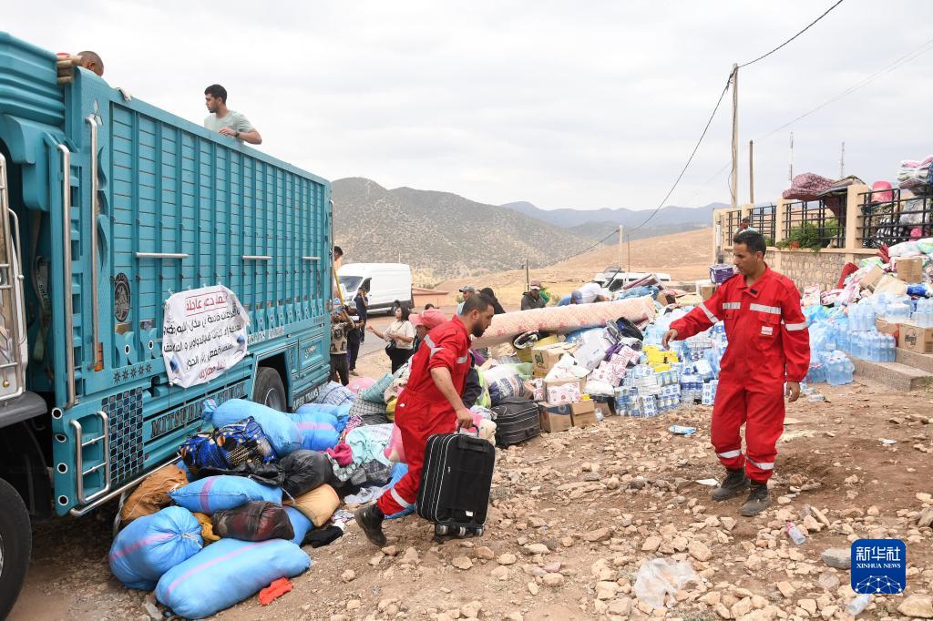 9月12日,救援人員在摩洛哥豪茲省的穆萊村搬運物資。
