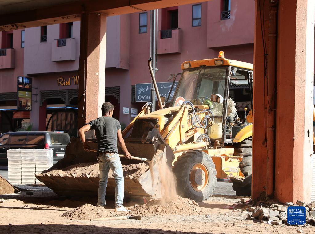 9月13日,工作人員在摩洛哥馬拉喀什老城的震后受損建筑旁清理瓦礫。