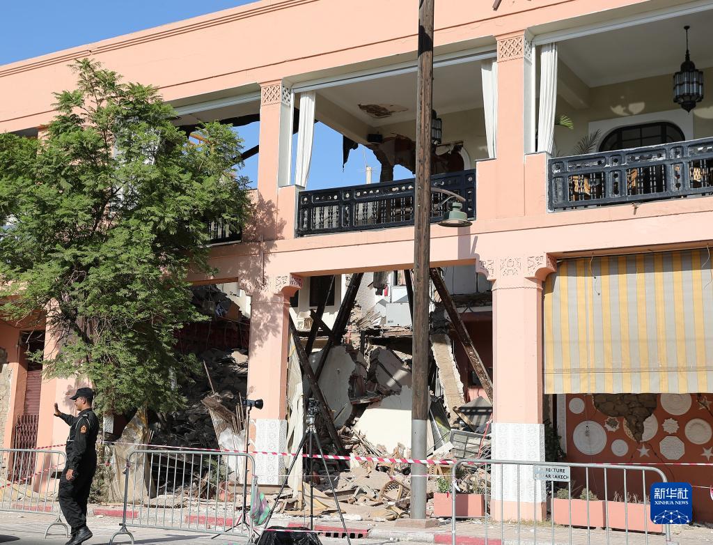 這是9月13日在摩洛哥馬拉喀什老城拍攝的一處震后受損建筑。