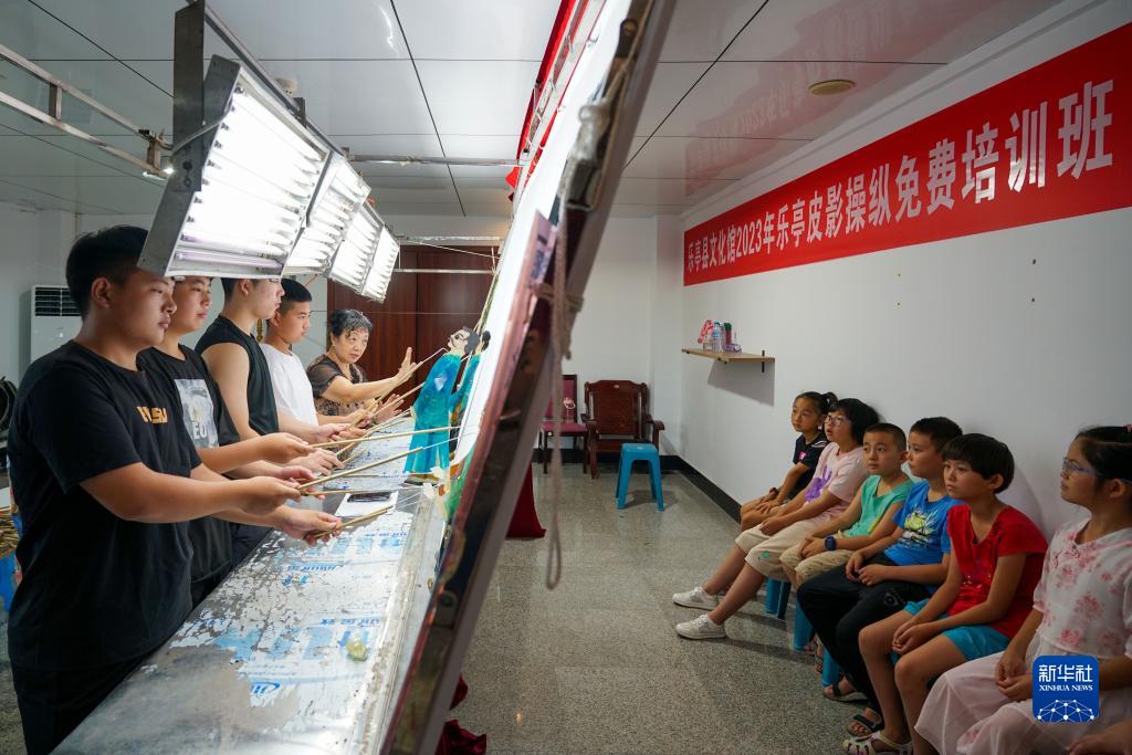 9月13日,學(xué)生們在河北省樂(lè )亭縣文化館皮影教室內學(xué)習皮影表演技巧。