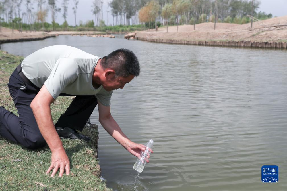 徐安宏在麋鹿活動(dòng)區域采集水樣(2023年8月21日攝)。新華社記者 楊磊 攝