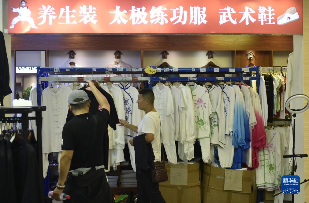 9月15日,游人在河南溫縣陳家溝的一家店鋪內挑選太極練功服。