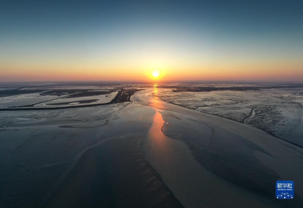 夕陽(yáng)下鹽城東臺條子泥濕地景色(2023年9月1日攝,無(wú)人機照片)。
