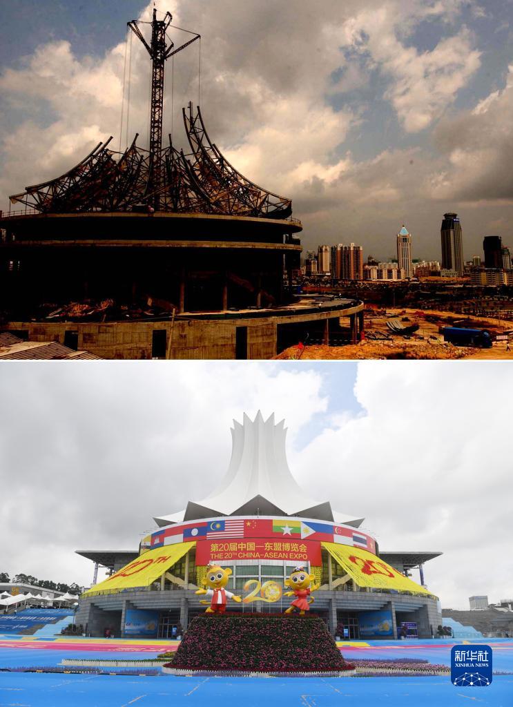 拼版照片:上圖為2003年5月7日拍攝的建設中的南寧國際會(huì )展中心(新華社記者劉廣銘攝);下圖為2023年9月17日拍攝的南寧國際會(huì )展中心(新華社記者陸波岸攝)。