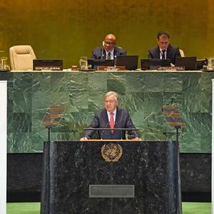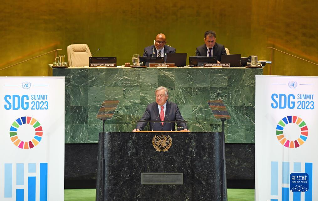 9月18日,在位于紐約的聯(lián)合國總部,聯(lián)合國秘書(shū)長(cháng)古特雷斯(前)在聯(lián)合國可持續發(fā)展目標峰會(huì )上講話(huà)。