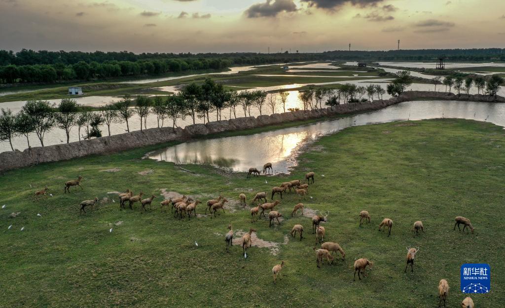 一群麋鹿在大豐麋鹿國家級自然保護區野鹿蕩憩息(8月20日攝,無(wú)人機照片)。