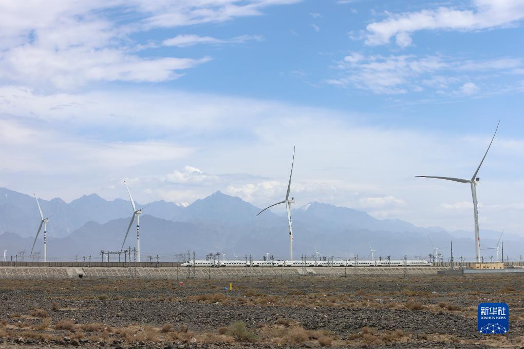 一輛列車(chē)駛過(guò)新疆達坂城風(fēng)電場(chǎng)(8月3日攝)。