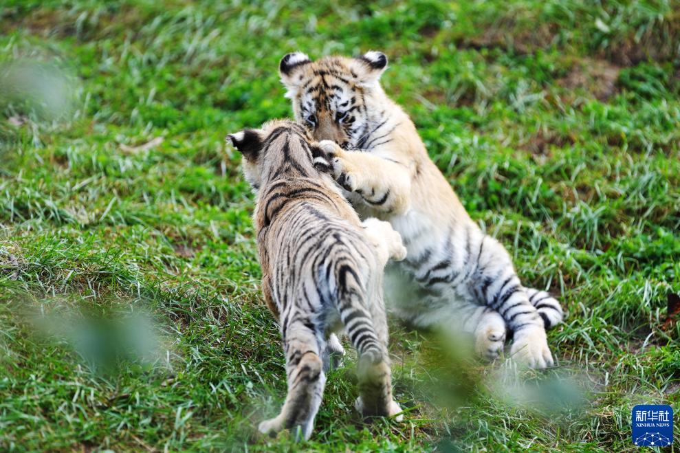 10月1日,橫道河子東北虎林園的幼虎在草地上玩鬧。