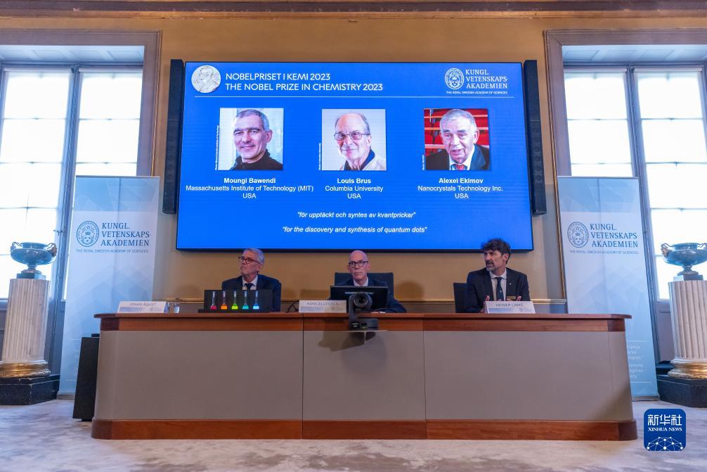 10月4日,在瑞典斯德哥爾摩的2023年諾貝爾化學(xué)獎公布現場(chǎng),屏幕上顯示獎項得主蒙吉·巴文迪(左)、路易斯·布魯斯(中)和阿列克謝·葉基莫夫的照片。