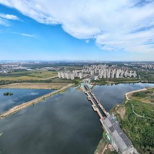 10月4日拍攝的廠(chǎng)通路潮白河大橋施工現場(chǎng)(無(wú)人機照片)。